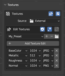 Click the plus button + to create a preset from the current Edit Textures settings and profiles, giving it a custom name. Click OK to save it.