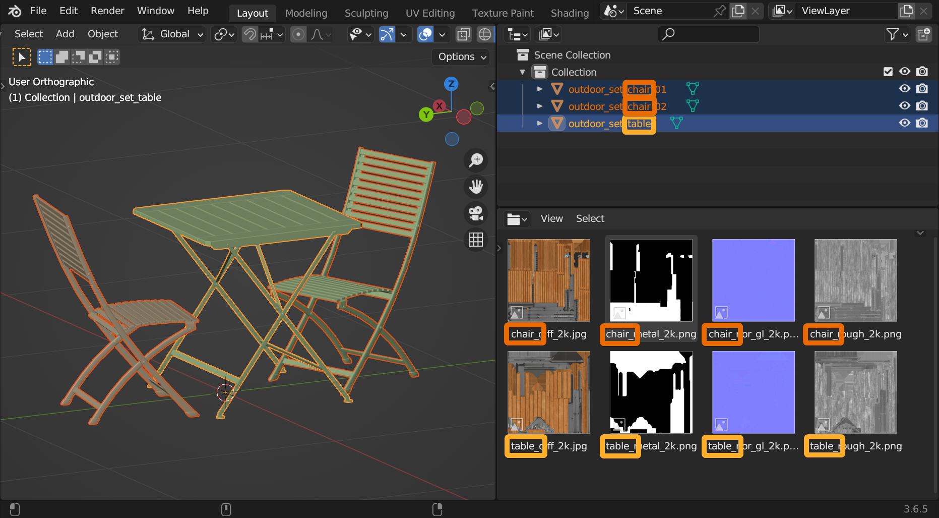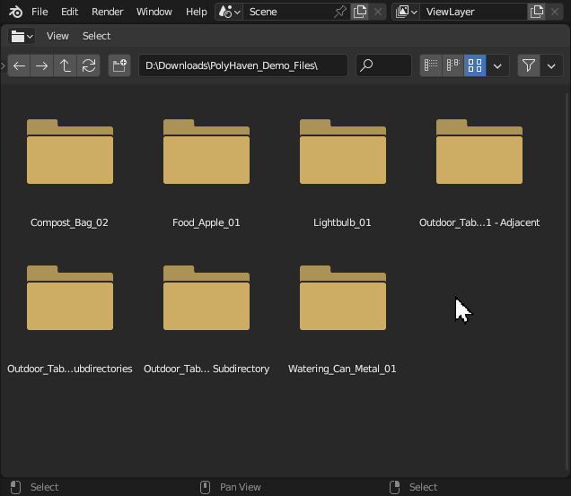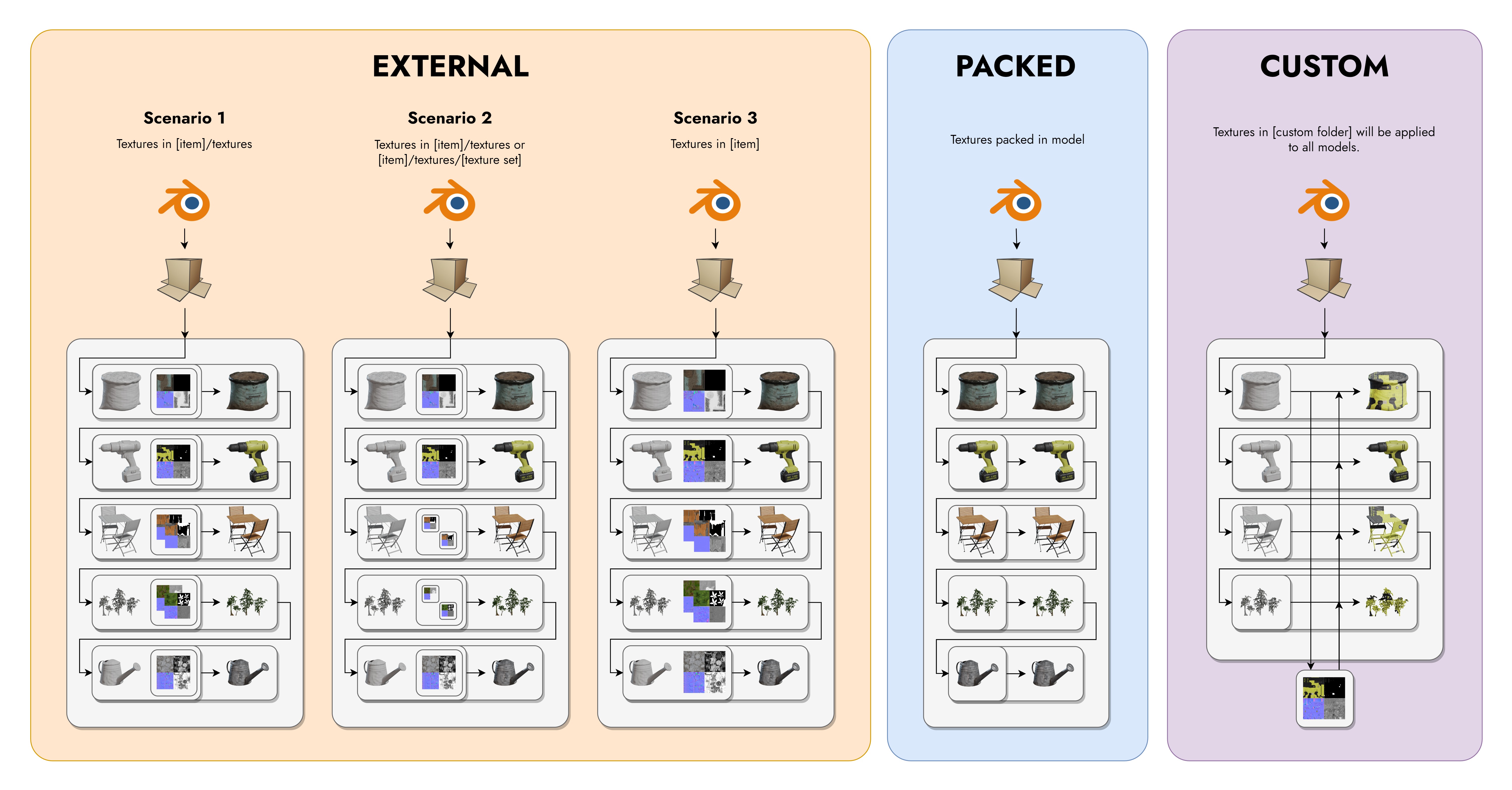 Models from Polyhaven (CC0). Each gray box with rounded corners indicates a directory/folder. The scenarios shown in the diagram above depend on whether the selected import or export formats support textures.