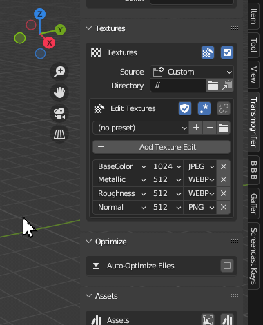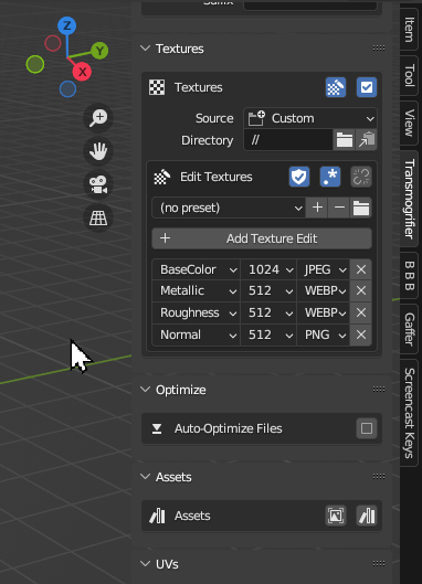 Custom tells Transmogrifier to use image textures from a single directory and apply them to all models converted.