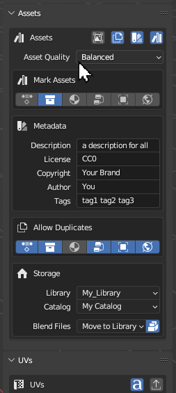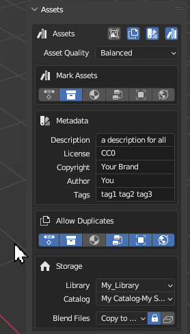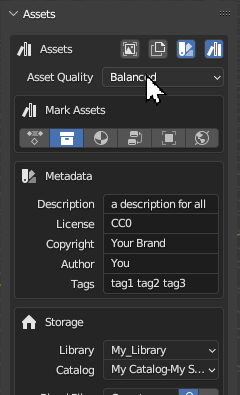 Add metadata that will be applied to all types of assets marked in every asset Blend file saved during the conversion.
