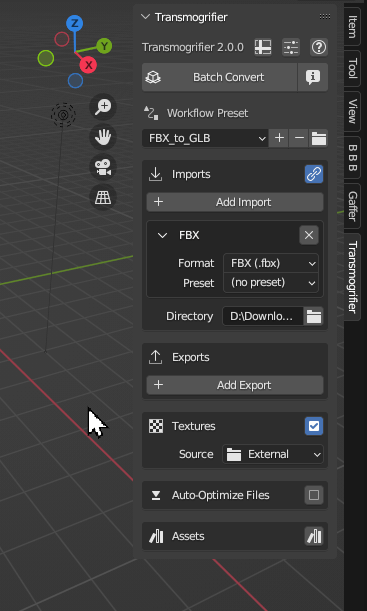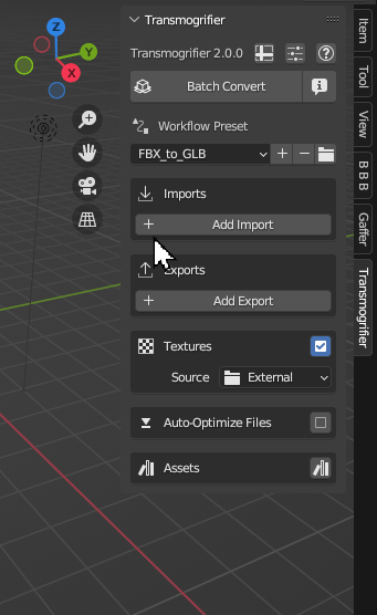 Click + Add Export to add an export file format for Transmogrifier to output for each import file it finds. Leave the format in its default value (GLB).